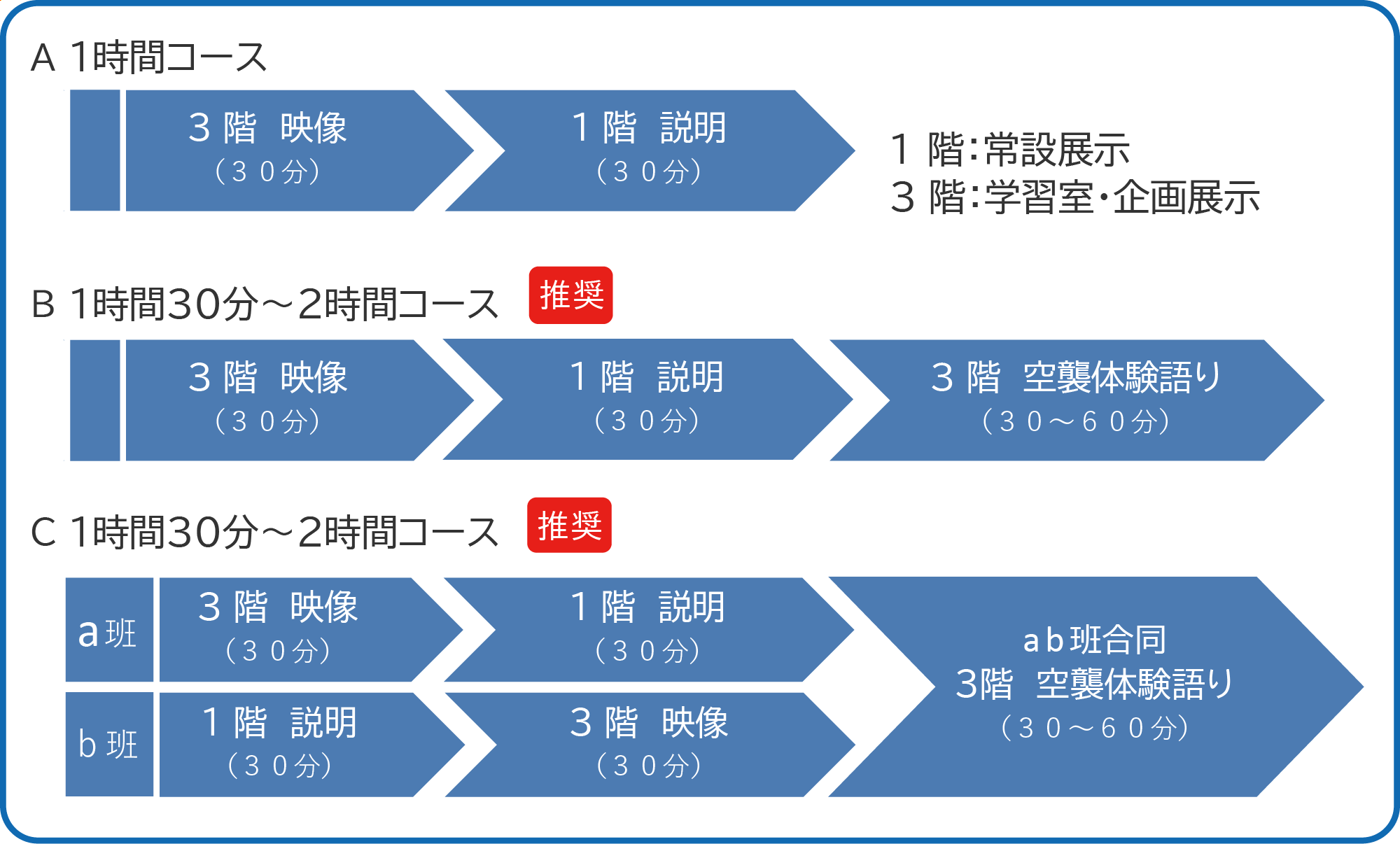 | ① 予約 | お電話:0258(36)3269 学校名・学年・人数・見学日時・内容・担当者名・連絡先 事前学習用カラー冊子『太平洋戦争と長岡空襲』の受渡方法 学びPOINT→ 事前学習をすることで館内見学時の学びが深まります バス待機場利用有無(要事前申込み) |