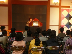長岡戦災資料館長が体験画や焼夷弾の模型、防空頭巾の複製品などの被災資料を用いて長岡空襲について解説し、長岡空襲の体験者で長岡戦災資料館運営ボランティアの木村初江さんが長岡空襲紙芝居の公演や、空襲の体験談の語りをしました。川口地域では、同じくボランティアの金子登美さんも空襲当時の状況を語りました。