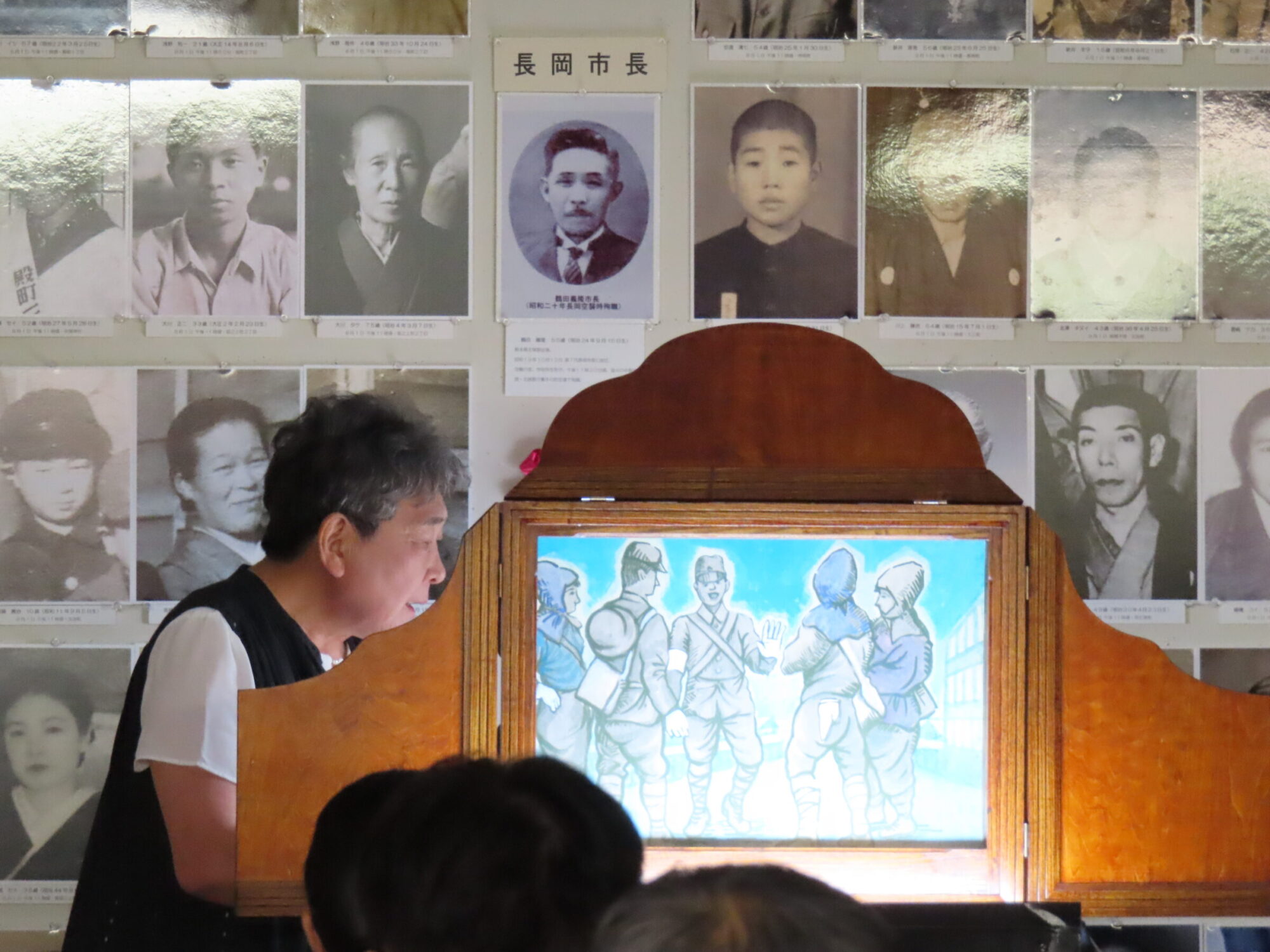 続いて、今井和江さんから長岡空襲紙芝居「思い出の記」を上演していただきました。今井さんの迫力ある感情が込められた公演は、当時の様子を鮮やかに描き出し、来場者も終始真剣な表情で聞き入っていました。